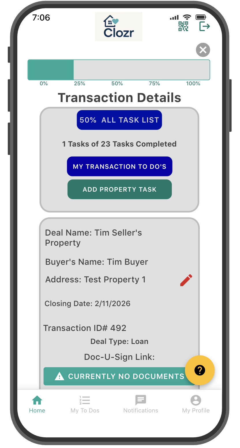 The Buyer or Seller Agents add the deal and details, then invite the Transaction Coordinators, Loan Processor, and Loan Originator to join the deal using Clozr. From there, everyone can see their tasks, notifications, messages, and progress. The Buyer and Seller clients can also be added to track their deal's progress without calling the Agent.